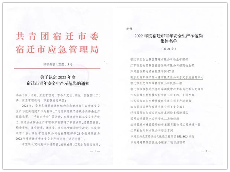 近日,共青团宿迁市委、宿迁市应急管理局联合印发了《关于认定2022年度宿迁市青年安全生产示范岗的通知》,水文水质监测中心获评“2022年度宿迁市青年安全生产示范岗”集体称号。