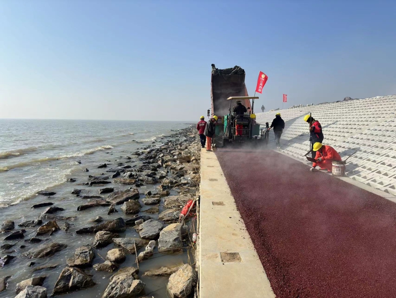 施工3标是滞洪区第一家开始彩色沥青混凝土施工的标段,标志着该标段已进入收尾阶段。现场沥青混凝土采用雅致“中国红”色,美观大方,摊铺后的人行步道,给初冬的滞洪区注入了一缕暖色,增添了一份活力。